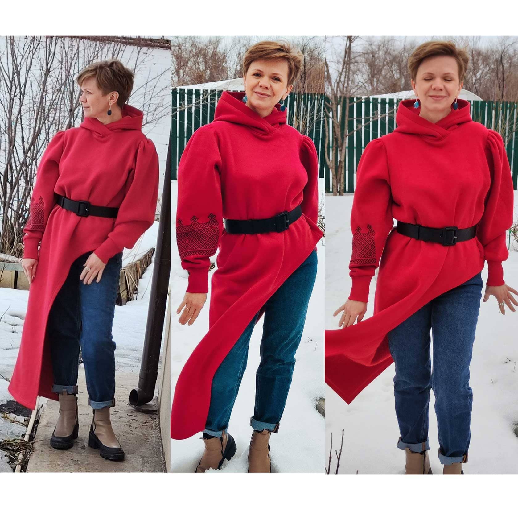 Это платье-худи с асимметричным вырезом не только согреет зимой, но и создаст уникальный выразительный образ. Пышные рукава в историческом стиле и вытачки на спине создают силуэт, который украшает, а не прячет фигуру. На рукаве — стилизованная вышивка в русском стиле. «Метелицу» можно носить с любым низом, она универсальная, как любая толстовка. Выполнена из теплого футера высшего качества с начесом.